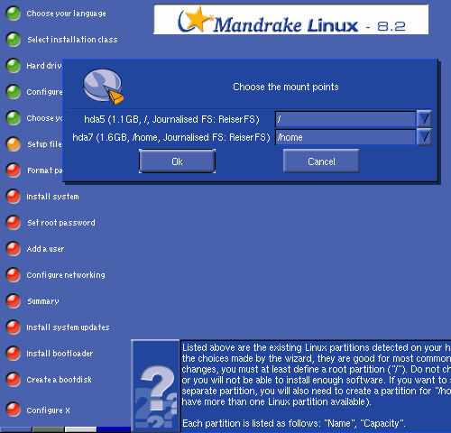 The installer will suggest mount points for the detected Linux partitions -- if this is acceptable, press "OK" to proceed or specify your own mount points by using the drop-down menus on the right side of each text field.